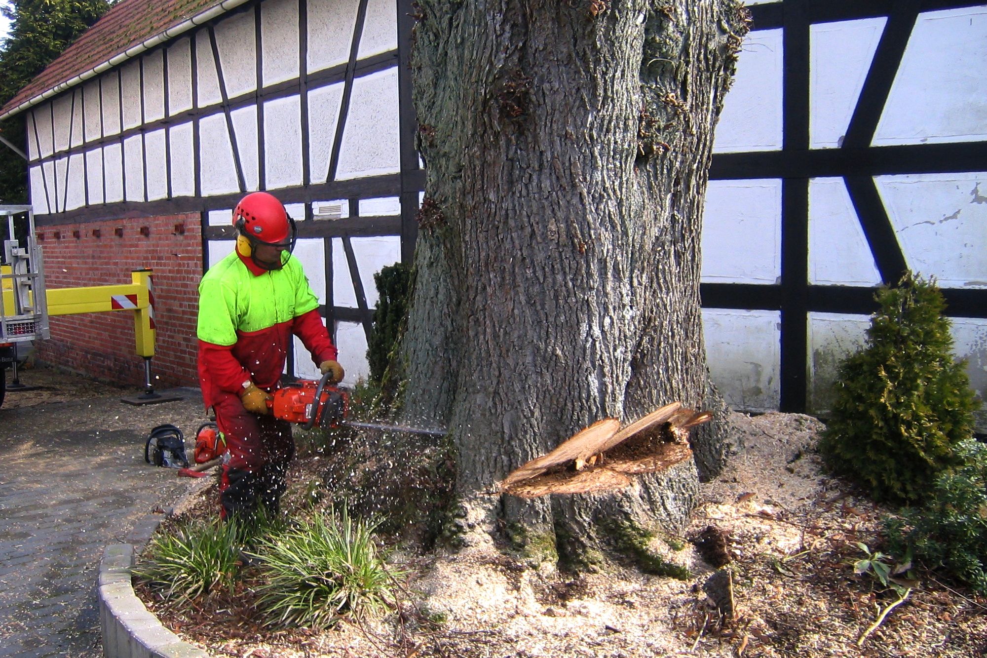 Im Bereich der Baumfällung ermöglichen unsere langjährige Erfahrung und geschulter Umgang mit professionellem Gerät eine präzise und sichere Arbeitsweise. Wir übernehmen das Fällen oder auch das Aussägen von Bäumen aller Art. Selbstverständlich stehen wir Ihnen auch für das Schreddern von Baumschnitt / Astwerk und ggf. die nachfolgende Abfuhr zur Verfügung.